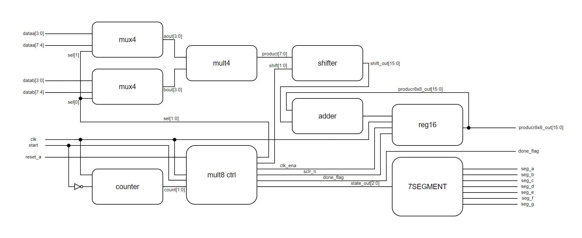 8-Bit Multiplier를 설계함에 있어 4-Bit Multiplier 모듈을 재사용하고 Finite State Machine 방식을 채택하도록 하겠다. 모듈의 재사용을 통해 8-Bit Multiplier 대비 논리 게이트의 갯수와 회로의 사이즈를 줄여 하드웨어 리소스를 절약할 수 있고 코드의 일관성을 유지할 수 있다. 또한, 이미 구현된 모듈을 활용하여 개발 시간을 단축하고 테스트 및 검증 측면에서도 신뢰성을 향상시킬 수 있다.