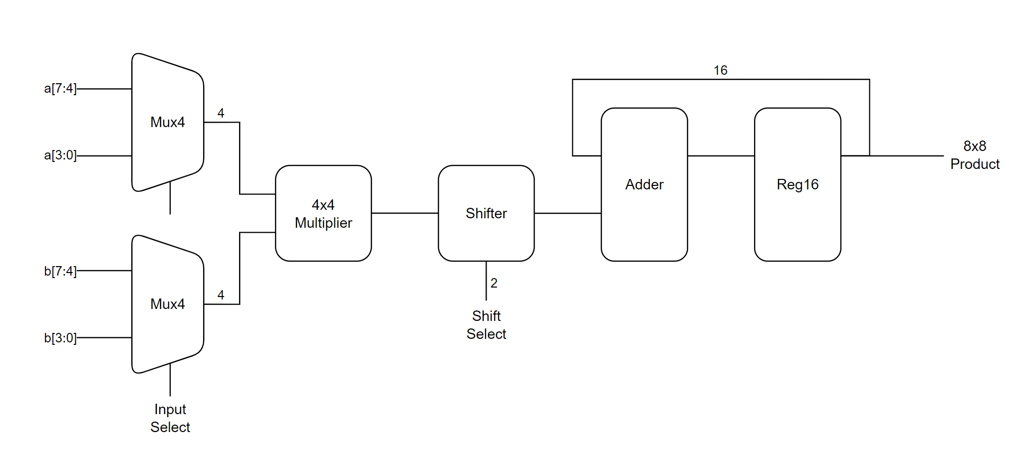 8-Bit Multiplier를 설계함에 있어 4-Bit Multiplier 모듈을 재사용하고 Finite State Machine 방식을 채택하도록 하겠다. 모듈의 재사용을 통해 8-Bit Multiplier 대비 논리 게이트의 갯수와 회로의 사이즈를 줄여 하드웨어 리소스를 절약할 수 있고 코드의 일관성을 유지할 수 있다. 또한, 이미 구현된 모듈을 활용하여 개발 시간을 단축하고 테스트 및 검증 측면에서도 신뢰성을 향상시킬 수 있다.