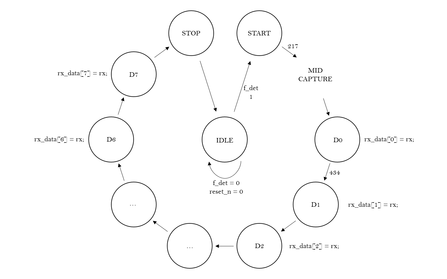 먼저 카운터를 설계한다. 그 이유는 8680ns 마다 1-Bit를 전송하므로 20ns의 주기를 가진 Clock을 초기화하지 않고 434 Cycle 동안 유지할 필요가 있기 때문이다. 다음으로 Data Frame에 맞게 Data, START, STOP Bit를 정의해 줄 Finite State Machine을 설계한다. FSM은 다음과 같다.