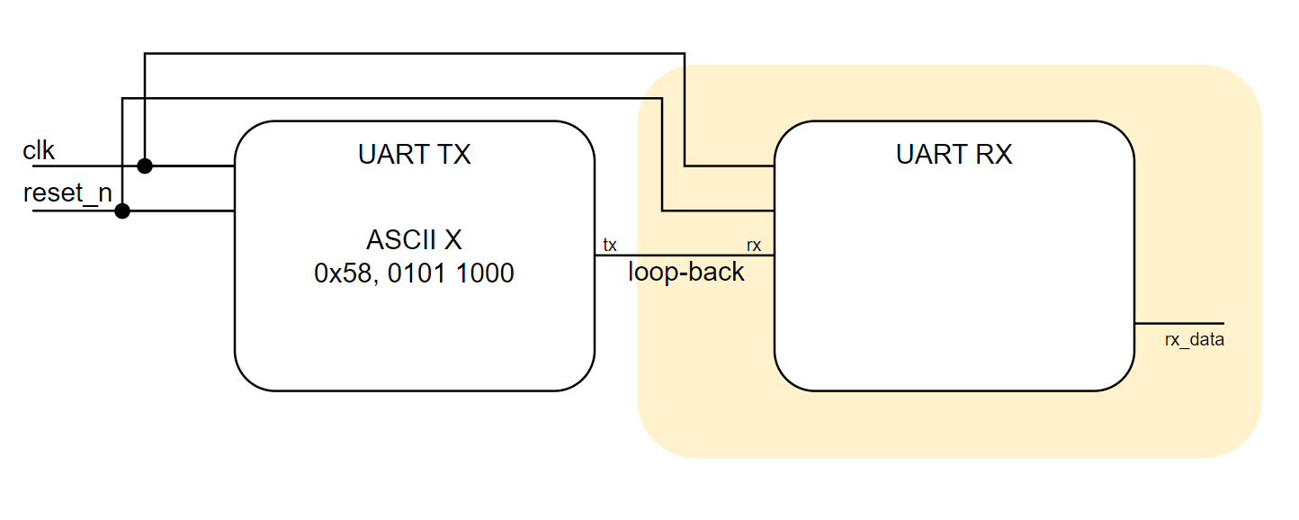 UART TX의 목표는 FT232BL 칩을 연결하여 임의로 지정한 TX(ASCII X, 0x58, 0x01011000)값이 Tera-term에 출력되도록 하는 것이다. UART TX의 Block Diagram은 아래와 같이 그릴 수 있다.