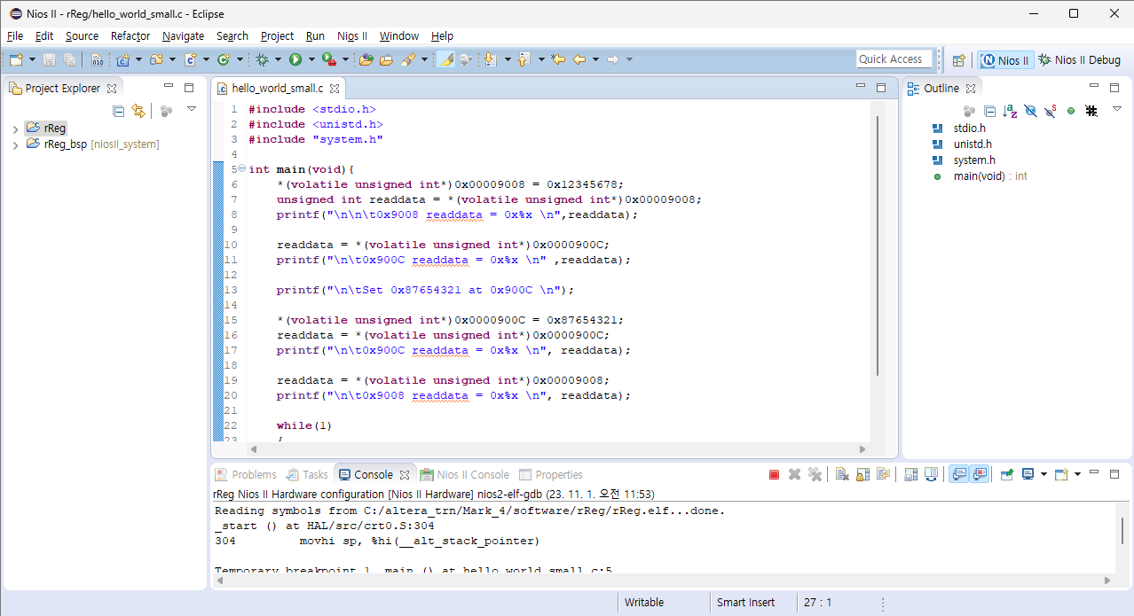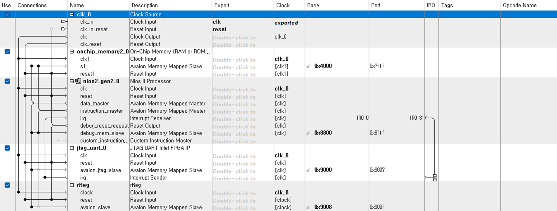 위에서 설계했던 Avalon Model과 rReg는 각각 Master와 Slave에 해당한다. Data의 read/write Transfer를 검증하기 위해 각각의 Verilog Code로 Component를 생성하고 연결해서 시스템을 구성해야한다. 하지만 Master(Avalon Model)는 이미 Nios II Processor가 그 역할을 대신하고 있으므로 Slave(rReg)만 생성하여 시스템에 추가하도록 한다.