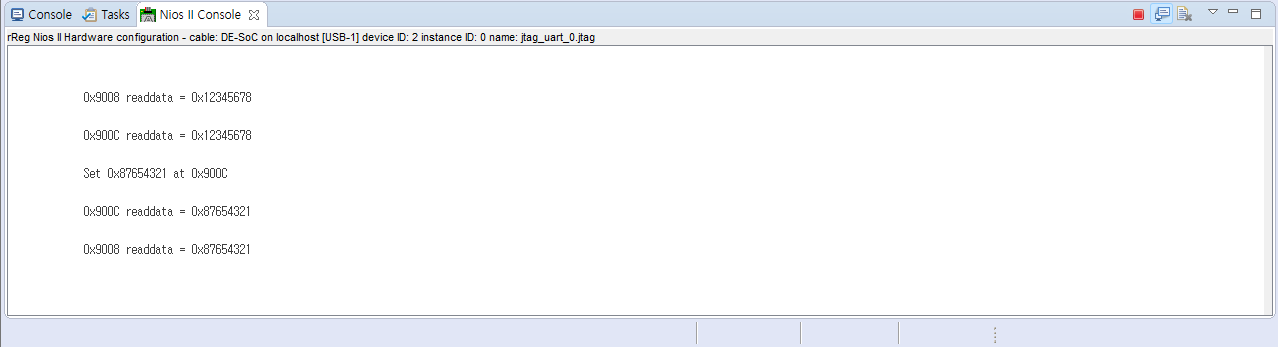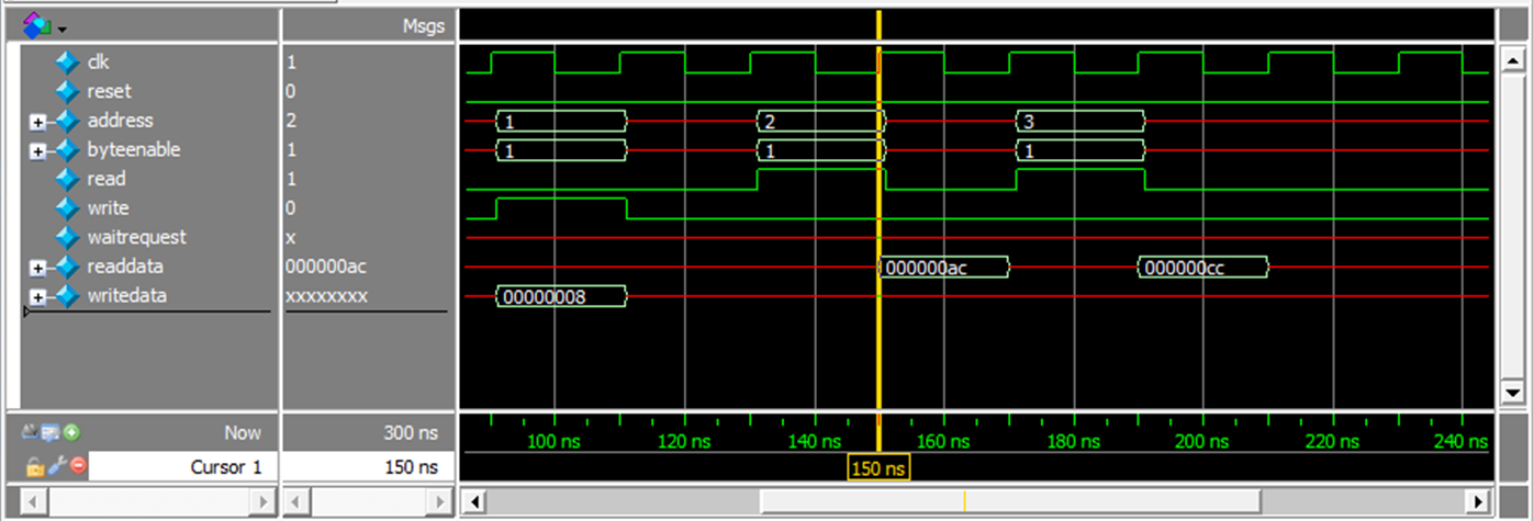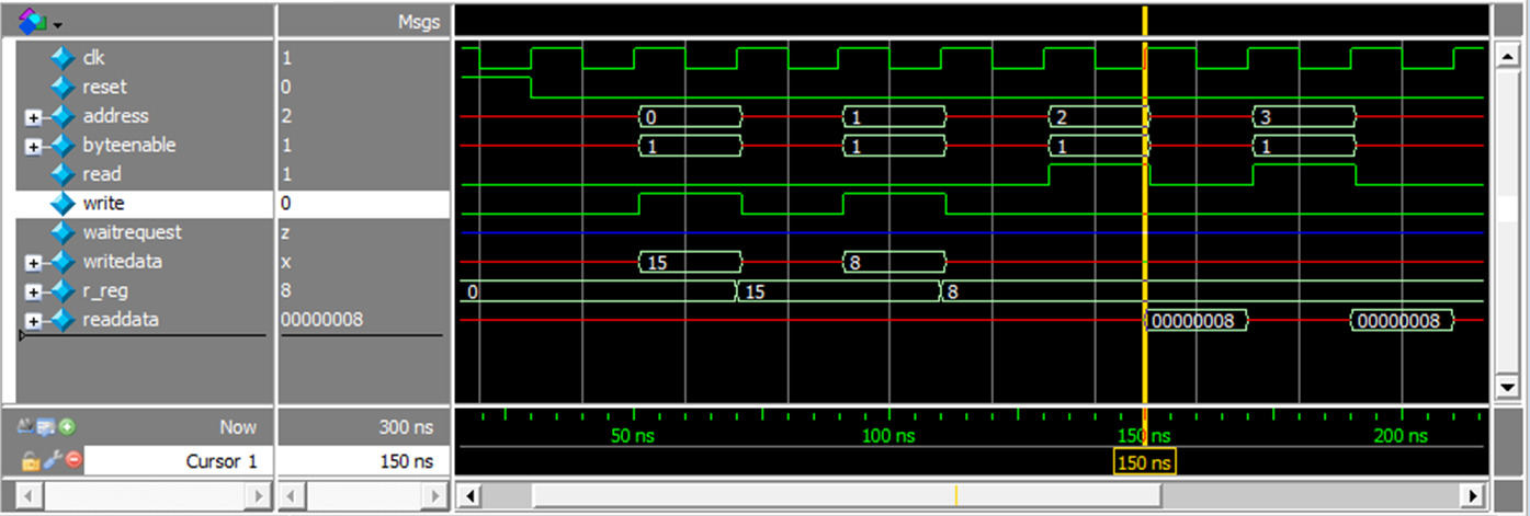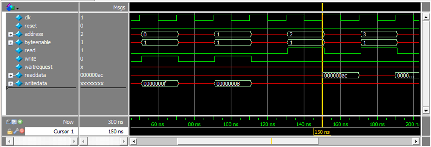 Memory와 연결된 상태가 아니기 때문에 Avalon Bus Model 설계 시 임의로 할당한 address와 writedata가 출력되는 것을 확인할 수 있고 read 신호 발생 시 레지스터에 저장된 데이터가 readdata로 출력되는 것 또한 확인할 수 있다.