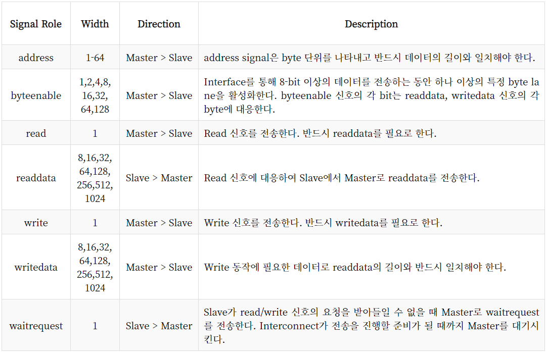 Signal Role은 Avalon Memory-Mapped Interface의 Master와 Slave 포트들의 Signal type을 나타낸다. 모든 Signal들을 사용하는 것도 아니고 모든 신호들을 반드시 필요로 하는 것도 아니다. 하지만 해당 인터페이스가 read-only일 때는 최소한 readdata가 필요하고, write-only일 때는 write, writedata가 최소한으로 필요하다.